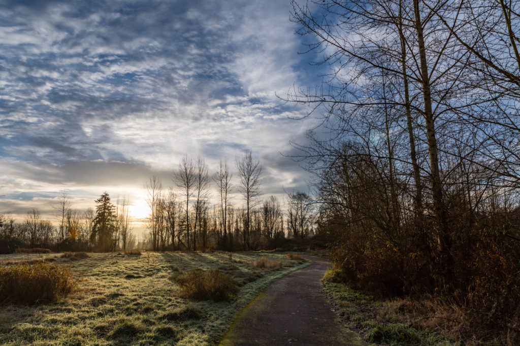 Cool winter morning sunrise on the Sammamish river trail with silhouettes of deciduous trees in Redmond Washington